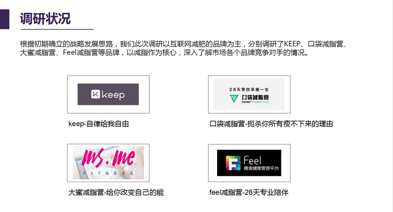 同時我們也同步開展市場調研。根據初期確立的戰略發展思路,我們此次調研以互聯網減肥的品牌為主,分別調研了KEEP、口袋減脂營、大蜜減脂營、Feel減脂營等品牌,以減脂作為核心,深入了解市場各個品牌競爭對手的情況。