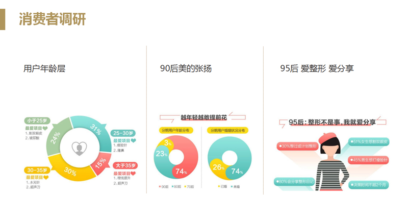 目標群體的擴大首先體現在年齡上:年齡段變寬。以往醫美行業的客戶群體主要是35歲到45歲的消費者,而現在醫美行業的主要顧客在20歲到55歲之間。其次,還體現在性別上:主要顧客仍是女性,但男性顧客明顯增多。